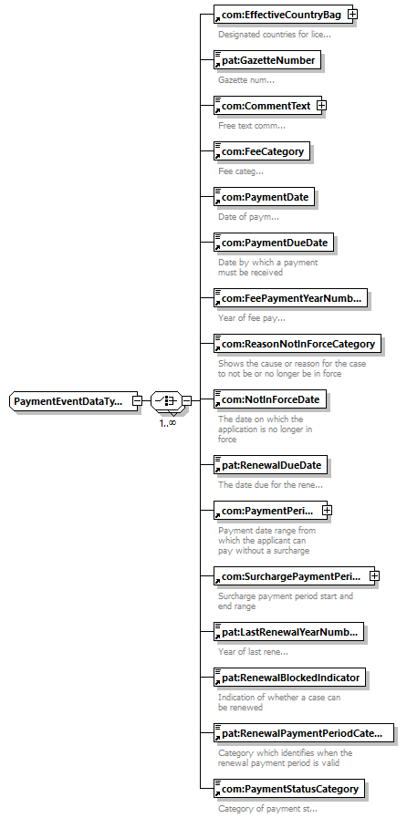 | children | com:EffectiveCountryBag pat:GazetteNumber com:CommentText com:FeeCategory com:PaymentDate com:PaymentDueDate com:FeePaymentYearNumber com:ReasonNotInForceCategory com:NotInForceDate pat:RenewalDueDate com:PaymentPeriod com:SurchargePaymentPeriod pat:LastRenewalYearNumber pat:RenewalBlockedIndicator pat:RenewalPaymentPeriodCategory com:PaymentStatusCategory | ||||