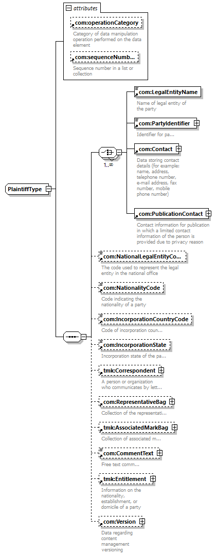 | children | com:LegalEntityName com:PartyIdentifier com:Contact com:PublicationContact com:NationalLegalEntityCode com:NationalityCode com:IncorporationCountryCode com:IncorporationState tmk:Correspondent com:RepresentativeBag tmk:AssociatedMarkBag com:CommentText tmk:Entitlement com:Version | |||||||||||||||||||||||||||||||||