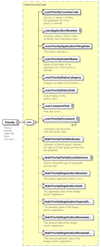 | children | com:PriorityCountryCode com:ApplicationNumber com:PriorityApplicationFilingDate com:PriorityHolderName com:PriorityStatusCategory com:PriorityStatusDate com:CommentText com:PriorityDocument tmk:PriorityPartialIndicator tmk:PriorityPartialGoodsServices tmk:PriorityRegistrationNumber tmk:PriorityRegistrationDate tmk:PriorityRegistrationExpiredDate tmk:PriorityRegistrationRenewedDate tmk:PriorityRegistrationRenewalExpiredDate | ||||