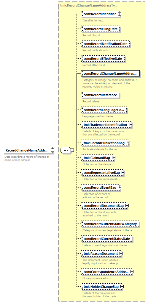 | children | com:RecordIdentifier com:RecordFilingDate com:RecordNotificationDate com:RecordEffectiveDate com:RecordChangeNameAddressCategory com:RecordReference com:RecordLanguageCode tmk:TrademarkIdentification tmk:RecordPublicationBag tmk:ClaimantBag com:RepresentativeBag com:RecordEventBag com:RecordDocumentBag com:RecordCurrentStatusCategory com:RecordCurrentStatusDate tmk:ReasonDocument com:CorrespondenceAddress tmk:HolderChangeBag | ||||