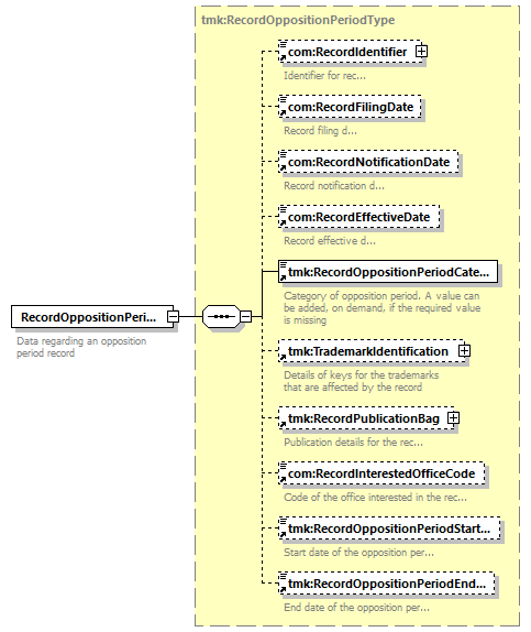 | children | com:RecordIdentifier com:RecordFilingDate com:RecordNotificationDate com:RecordEffectiveDate tmk:RecordOppositionPeriodCategory tmk:TrademarkIdentification tmk:RecordPublicationBag com:RecordInterestedOfficeCode tmk:RecordOppositionPeriodStartDate tmk:RecordOppositionPeriodEndDate | ||||