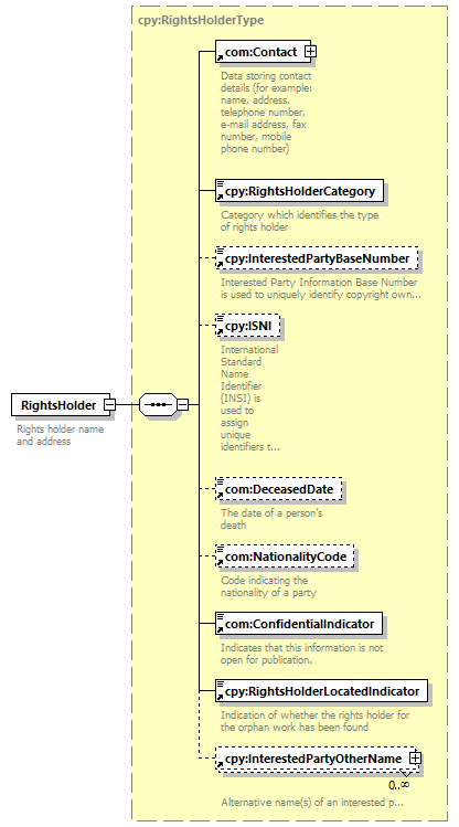| children | com:Contact cpy:RightsHolderCategory cpy:InterestedPartyBaseNumber cpy:ISNI com:DeceasedDate com:NationalityCode com:ConfidentialIndicator cpy:RightsHolderLocatedIndicator cpy:InterestedPartyOtherName | ||||