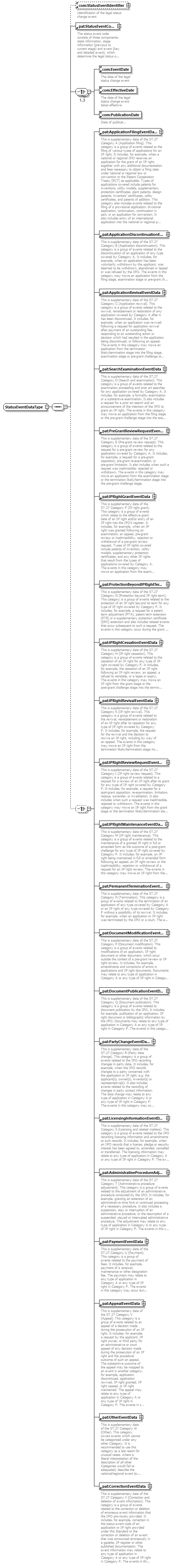 | children | com:StatusEventIdentifier pat:StatusEventCode com:EventDate com:EffectiveDate com:PublicationDate pat:ApplicationFilingEventData pat:ApplicationDiscontinuationEventData pat:ApplicationRevivalEventData pat:SearchExaminationEventData pat:PreGrantReviewRequestEventData pat:IPRightGrantEventData pat:ProtectionBeyondIPRightTermEventData pat:IPRightCessationEventData pat:IPRightRevivalEventData pat:IPRightReviewRequestEventData pat:IPRightMaintenanceEventData pat:PermanentTerminationEventData pat:DocumentModificationEventData pat:DocumentPublicationEventData pat:PartyChangeEventData pat:LicensingInformationEventData pat:AdministrativeProcedureAdjustmentEventData pat:PaymentEventData pat:AppealEventData pat:OtherEventData pat:CorrectionEventData | ||||