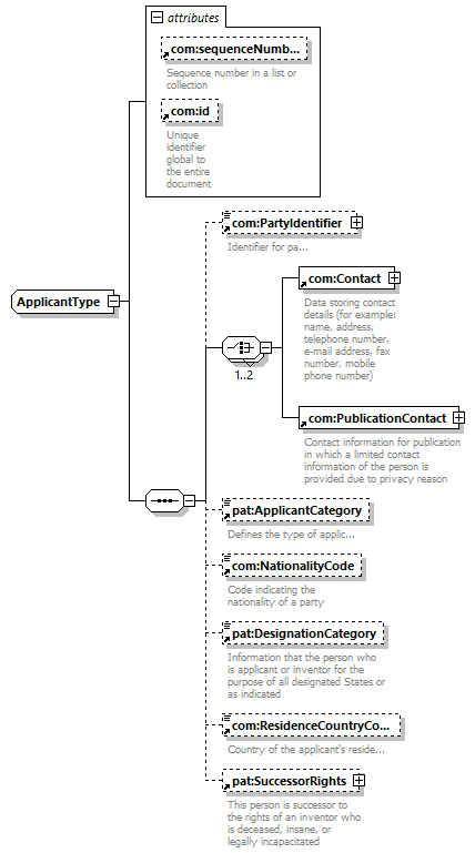| children | com:PartyIdentifier com:Contact com:PublicationContact pat:ApplicantCategory com:NationalityCode pat:DesignationCategory com:ResidenceCountryCode pat:SuccessorRights | |||||||||||||||||||||||||||||||||