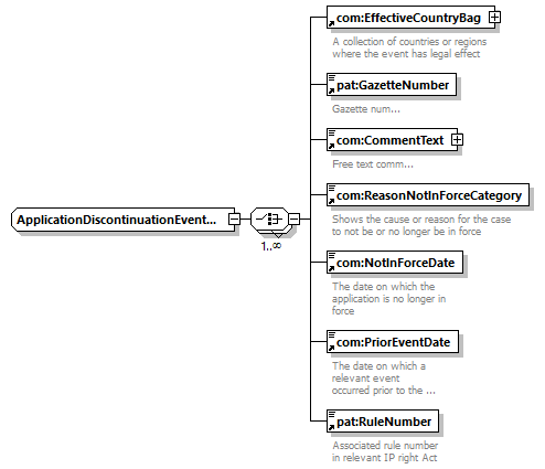 | children | com:EffectiveCountryBag pat:GazetteNumber com:CommentText com:ReasonNotInForceCategory com:NotInForceDate com:PriorEventDate pat:RuleNumber | ||||