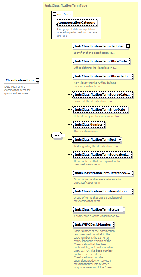 | children | tmk:ClassificationTermIdentifier tmk:ClassificationTermOfficeCode tmk:ClassificationTermOfficeIdentification tmk:ClassificationTermSourceCategory tmk:ClassificationTermEntryDate tmk:ClassNumber tmk:ClassificationTermText tmk:ClassificationTermEquivalentGroup tmk:ClassificationTermReferenceGroup tmk:ClassificationTermTranslationGroup tmk:ClassificationTermStatus tmk:WIPOBasicNumber | ||||||||||||||||||||||