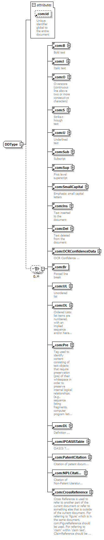 | children | com:B com:I com:O com:S com:U com:Sub com:Sup com:SmallCapital com:Ins com:Del com:OCRConfidenceData com:Br com:UL com:OL com:Pre com:DL com:IPOASISTable com:PatentCitation com:NPLCitation com:CrossReference | ||||||||||||||||||||||