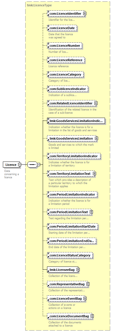 | children | com:LicenceIdentifier com:LicenceDate com:LicenceNumber com:LicenceReference com:LicenceCategory com:SublicenceIndicator com:RelatedLicenceIdentifier tmk:GoodsServicesLimitationIndicator tmk:GoodsServicesLimitation com:TerritoryLimitationIndicator com:TerritoryLimitationText com:PeriodLimitationIndicator com:PeriodLimitationText com:PeriodLimitationStartDate com:PeriodLimitationEndDate com:LicenceStatusCategory tmk:LicenseeBag com:RepresentativeBag com:LicenceEventBag com:LicenceDocumentBag | ||||