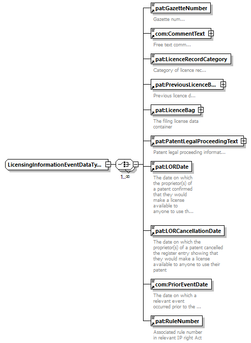 | children | pat:GazetteNumber com:CommentText pat:LicenceRecordCategory pat:PreviousLicenceBag pat:LicenceBag pat:PatentLegalProceedingText pat:LORDate pat:LORCancellationDate com:PriorEventDate pat:RuleNumber | ||||