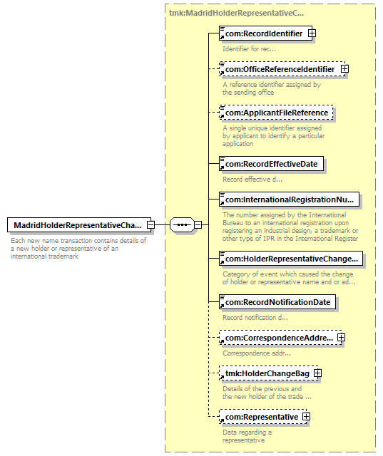 | children | com:RecordIdentifier com:OfficeReferenceIdentifier com:ApplicantFileReference com:RecordEffectiveDate com:InternationalRegistrationNumber com:HolderRepresentativeChangeCategory com:RecordNotificationDate com:CorrespondenceAddress tmk:HolderChangeBag com:Representative | ||||