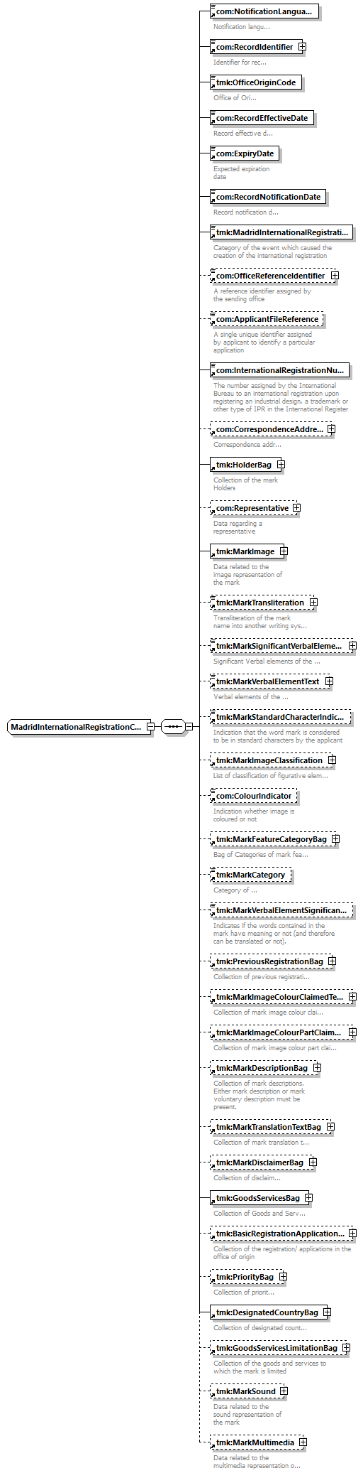 | children | com:NotificationLanguage com:RecordIdentifier tmk:OfficeOriginCode com:RecordEffectiveDate com:ExpiryDate com:RecordNotificationDate tmk:MadridInternationalRegistrationCreationCategory com:OfficeReferenceIdentifier com:ApplicantFileReference com:InternationalRegistrationNumber com:CorrespondenceAddress tmk:HolderBag com:Representative tmk:MarkImage tmk:MarkTransliteration tmk:MarkSignificantVerbalElementText tmk:MarkVerbalElementText tmk:MarkStandardCharacterIndicator tmk:MarkImageClassification com:ColourIndicator tmk:MarkFeatureCategoryBag tmk:MarkCategory tmk:MarkVerbalElementSignificantIndicator tmk:PreviousRegistrationBag tmk:MarkImageColourClaimedTextBag tmk:MarkImageColourPartClaimedTextBag tmk:MarkDescriptionBag tmk:MarkTranslationTextBag tmk:MarkDisclaimerBag tmk:GoodsServicesBag tmk:BasicRegistrationApplicationBag tmk:PriorityBag tmk:DesignatedCountryBag tmk:GoodsServicesLimitationBag tmk:MarkSound tmk:MarkMultimedia | ||||