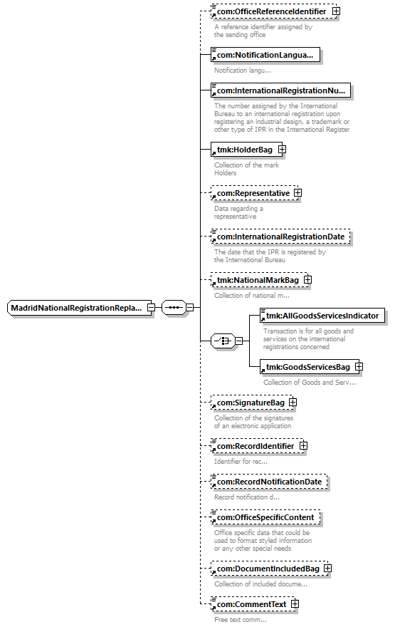 | children | com:OfficeReferenceIdentifier com:NotificationLanguage com:InternationalRegistrationNumber tmk:HolderBag com:Representative com:InternationalRegistrationDate tmk:NationalMarkBag tmk:AllGoodsServicesIndicator tmk:GoodsServicesBag com:SignatureBag com:RecordIdentifier com:RecordNotificationDate com:OfficeSpecificContent com:DocumentIncludedBag com:CommentText | ||||