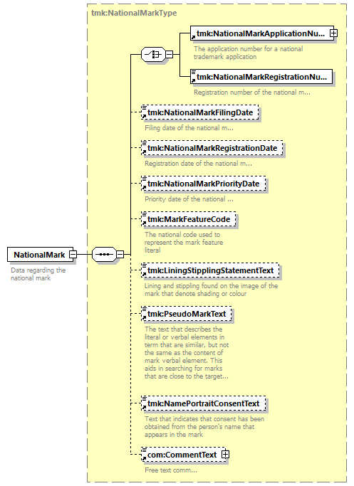 | children | tmk:NationalMarkApplicationNumber tmk:NationalMarkRegistrationNumber tmk:NationalMarkFilingDate tmk:NationalMarkRegistrationDate tmk:NationalMarkPriorityDate tmk:MarkFeatureCode tmk:LiningStipplingStatementText tmk:PseudoMarkText tmk:NamePortraitConsentText com:CommentText | ||||