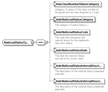 | children | tmk:ClassNumberStatusCategory tmk:NationalStatusCategory tmk:NationalStatusCode tmk:NationalStatusDate tmk:NationalStatusInternalDescriptionText tmk:NationalStatusExternalDescriptionText | ||||