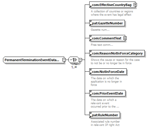 | children | com:EffectiveCountryBag pat:GazetteNumber com:CommentText com:ReasonNotInForceCategory com:NotInForceDate com:PriorEventDate pat:RuleNumber | ||||