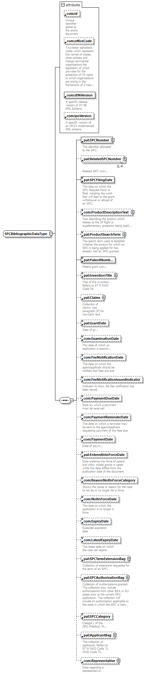 | children | pat:SPCNumber pat:RelatedSPCNumber pat:SPCFilingDate com:ProductDescriptionText pat:ProductSearchTerm pat:PatentNumber pat:InventionTitle pat:Claims pat:GrantDate com:ExaminationDate com:FeeNotificationDate com:FeeNotificationIssuedIndicator com:PaymentDueDate com:PaymentReminderDate com:PaymentDate pat:EnteredIntoForceDate com:ReasonNotInForceCategory com:NotInForceDate com:ExpiryDate com:LatestExpiryDate pat:SPCTermExtensionBag pat:SPCAuthorizationBag pat:SPCCategory pat:ApplicantBag com:Representative | |||||||||||||||||||||||||||||||||||||||||||||||||||||||