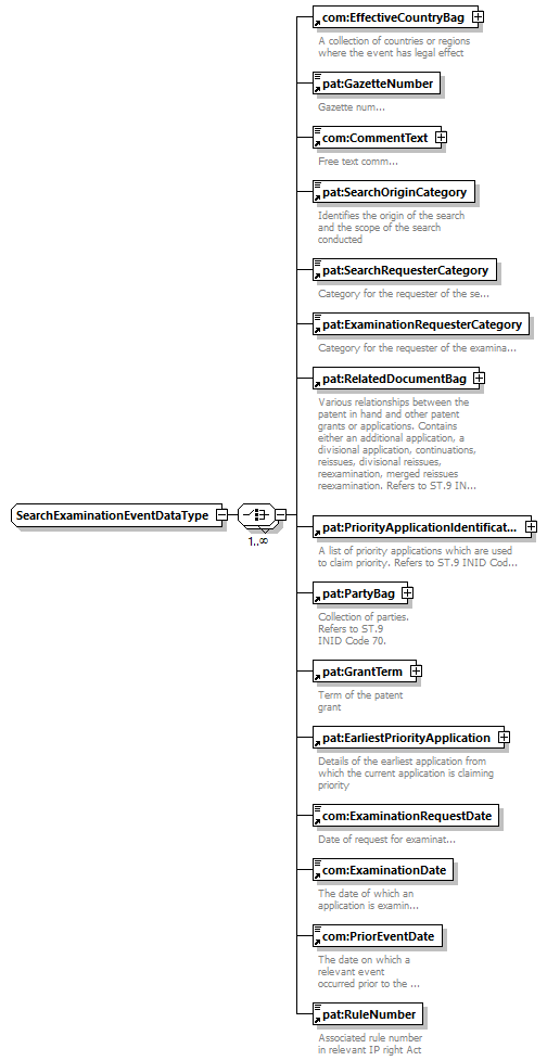 | children | com:EffectiveCountryBag pat:GazetteNumber com:CommentText pat:SearchOriginCategory pat:SearchRequesterCategory pat:ExaminationRequesterCategory pat:RelatedDocumentBag pat:PriorityApplicationIdentificationBag pat:PartyBag pat:GrantTerm pat:EarliestPriorityApplication com:ExaminationRequestDate com:ExaminationDate com:PriorEventDate pat:RuleNumber | ||||