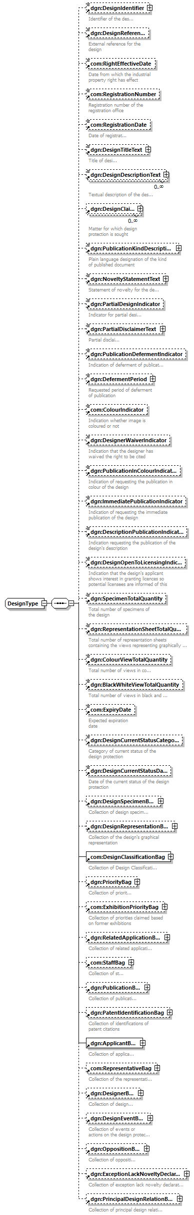 | children | dgn:DesignIdentifier dgn:DesignReference com:RightEffectiveDate com:RegistrationNumber com:RegistrationDate dgn:DesignTitleText dgn:DesignDescriptionText dgn:DesignClaim dgn:PublicationKindDescription dgn:NoveltyStatementText dgn:PartialDesignIndicator dgn:PartialDisclaimerText dgn:PublicationDefermentIndicator dgn:DefermentPeriod com:ColourIndicator dgn:DesignerWaiverIndicator dgn:PublicationInColourIndicator dgn:ImmediatePublicationIndicator dgn:DescriptionPublicationIndicator dgn:DesignOpenToLicensingIndicator dgn:SpecimenTotalQuantity dgn:RepresentationSheetTotalQuantity dgn:ColourViewTotalQuantity dgn:BlackWhiteViewTotalQuantity com:ExpiryDate dgn:DesignCurrentStatusCategory dgn:DesignCurrentStatusDate dgn:DesignSpecimenBag dgn:DesignRepresentationBag com:DesignClassificationBag dgn:PriorityBag com:ExhibitionPriorityBag dgn:RelatedApplicationBag com:StaffBag dgn:PublicationBag dgn:PatentIdentificationBag dgn:ApplicantBag com:RepresentativeBag dgn:DesignerBag dgn:DesignEventBag dgn:OppositionBag dgn:ExceptionLackNoveltyDeclarationBag dgn:PrincipalDesignRelationBag | ||||