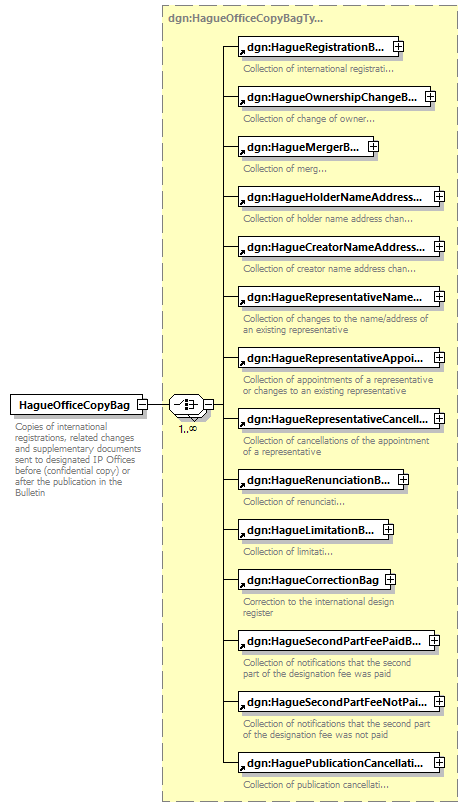 | children | dgn:HagueRegistrationBag dgn:HagueOwnershipChangeBag dgn:HagueMergerBag dgn:HagueHolderNameAddressChangeBag dgn:HagueCreatorNameAddressChangeBag dgn:HagueRepresentativeNameAddressChangeBag dgn:HagueRepresentativeAppointmentBag dgn:HagueRepresentativeCancellationBag dgn:HagueRenunciationBag dgn:HagueLimitationBag dgn:HagueCorrectionBag dgn:HagueSecondPartFeePaidBag dgn:HagueSecondPartFeeNotPaidBag dgn:HaguePublicationCancellationBag | ||||