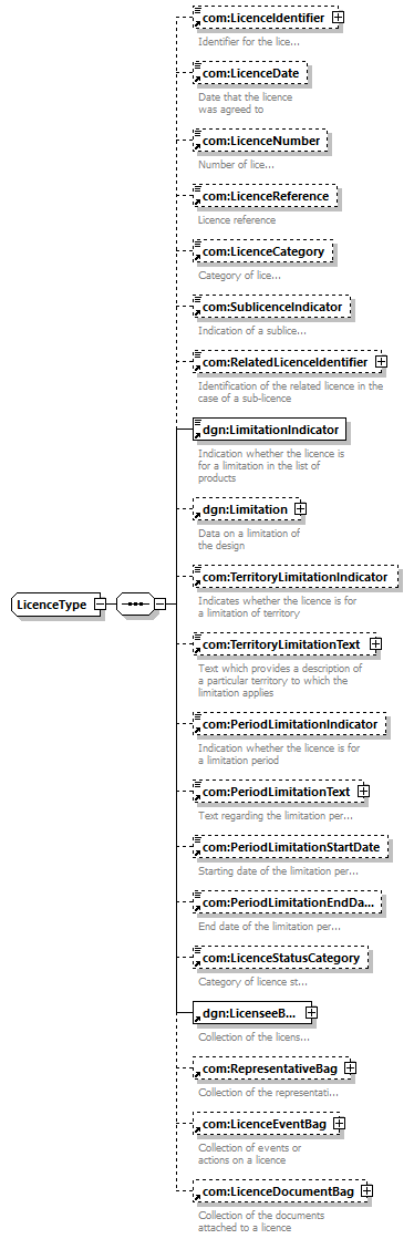 | children | com:LicenceIdentifier com:LicenceDate com:LicenceNumber com:LicenceReference com:LicenceCategory com:SublicenceIndicator com:RelatedLicenceIdentifier dgn:LimitationIndicator dgn:Limitation com:TerritoryLimitationIndicator com:TerritoryLimitationText com:PeriodLimitationIndicator com:PeriodLimitationText com:PeriodLimitationStartDate com:PeriodLimitationEndDate com:LicenceStatusCategory dgn:LicenseeBag com:RepresentativeBag com:LicenceEventBag com:LicenceDocumentBag | ||||