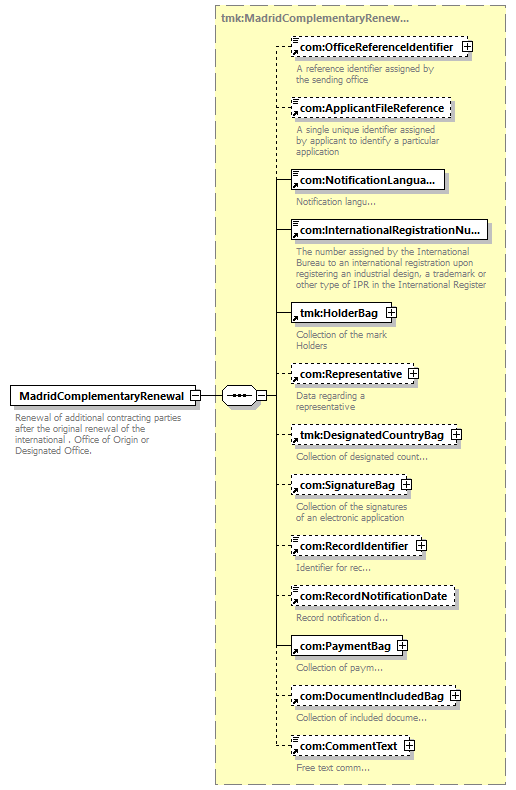 | children | com:OfficeReferenceIdentifier com:ApplicantFileReference com:NotificationLanguage com:InternationalRegistrationNumber tmk:HolderBag com:Representative tmk:DesignatedCountryBag com:SignatureBag com:RecordIdentifier com:RecordNotificationDate com:PaymentBag com:DocumentIncludedBag com:CommentText | ||||