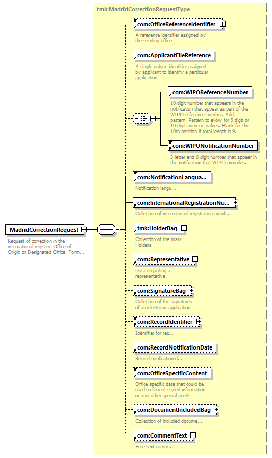| children | com:OfficeReferenceIdentifier com:ApplicantFileReference com:WIPOReferenceNumber com:WIPONotificationNumber com:NotificationLanguage com:InternationalRegistrationNumberBag tmk:HolderBag com:Representative com:SignatureBag com:RecordIdentifier com:RecordNotificationDate com:OfficeSpecificContent com:DocumentIncludedBag com:CommentText | ||||