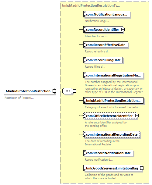 | children | com:NotificationLanguage com:RecordIdentifier com:RecordEffectiveDate com:RecordFilingDate com:InternationalRegistrationNumber tmk:MadridProtectionRestrictionCategory com:OfficeReferenceIdentifier com:InternationalRecordingDate com:RecordNotificationDate tmk:GoodsServicesLimitationBag | ||||