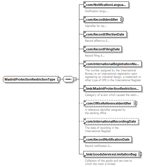 | children | com:NotificationLanguage com:RecordIdentifier com:RecordEffectiveDate com:RecordFilingDate com:InternationalRegistrationNumber tmk:MadridProtectionRestrictionCategory com:OfficeReferenceIdentifier com:InternationalRecordingDate com:RecordNotificationDate tmk:GoodsServicesLimitationBag | ||||
