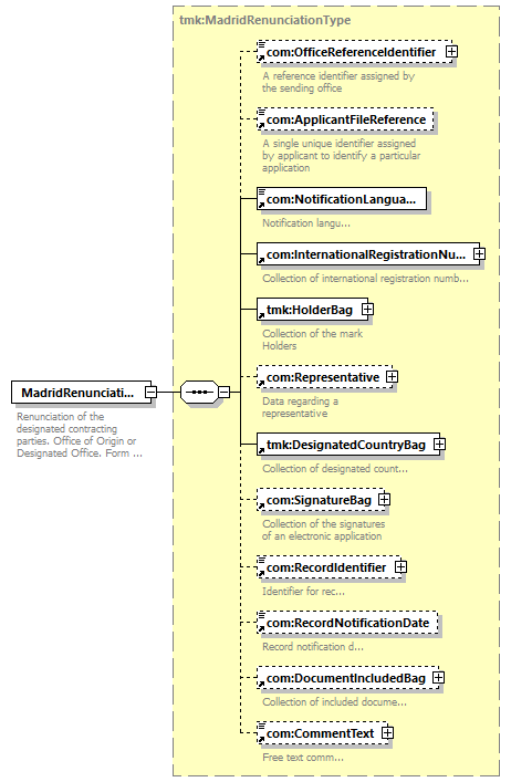 | children | com:OfficeReferenceIdentifier com:ApplicantFileReference com:NotificationLanguage com:InternationalRegistrationNumberBag tmk:HolderBag com:Representative tmk:DesignatedCountryBag com:SignatureBag com:RecordIdentifier com:RecordNotificationDate com:DocumentIncludedBag com:CommentText | ||||