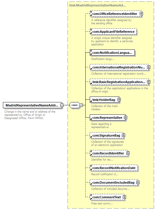 | children | com:OfficeReferenceIdentifier com:ApplicantFileReference com:NotificationLanguage com:InternationalRegistrationNumberBag tmk:BasicRegistrationApplicationBag tmk:HolderBag com:Representative com:SignatureBag com:RecordIdentifier com:RecordNotificationDate com:DocumentIncludedBag com:CommentText | ||||