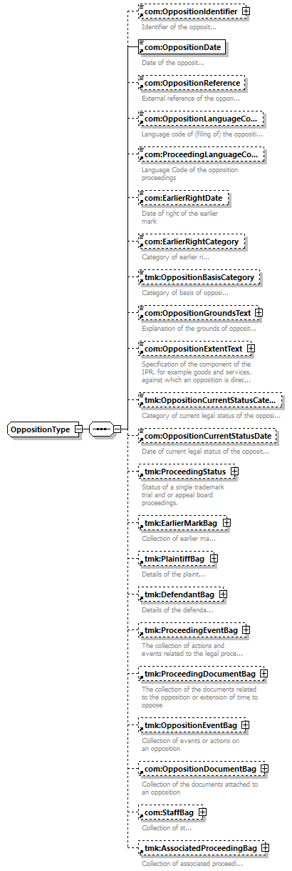 | children | com:OppositionIdentifier com:OppositionDate com:OppositionReference com:OppositionLanguageCode com:ProceedingLanguageCode com:EarlierRightDate com:EarlierRightCategory tmk:OppositionBasisCategory com:OppositionGroundsText com:OppositionExtentText tmk:OppositionCurrentStatusCategory com:OppositionCurrentStatusDate tmk:ProceedingStatus tmk:EarlierMarkBag tmk:PlaintiffBag tmk:DefendantBag tmk:ProceedingEventBag tmk:ProceedingDocumentBag tmk:OppositionEventBag com:OppositionDocumentBag com:StaffBag tmk:AssociatedProceedingBag | ||||