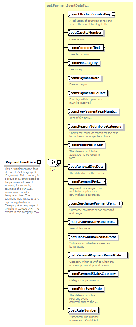 | children | com:EffectiveCountryBag pat:GazetteNumber com:CommentText com:FeeCategory com:PaymentDate com:PaymentDueDate com:FeePaymentYearNumber com:ReasonNotInForceCategory com:NotInForceDate pat:RenewalDueDate com:PaymentPeriod com:SurchargePaymentPeriod pat:LastRenewalYearNumber pat:RenewalBlockedIndicator pat:RenewalPaymentPeriodCategory com:PaymentStatusCategory com:PriorEventDate pat:RuleNumber | ||||