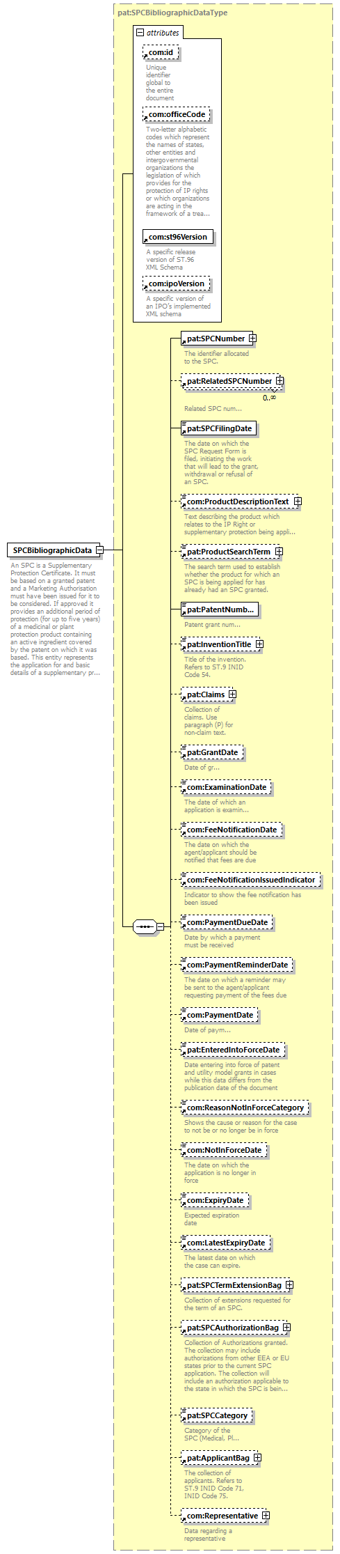 | children | pat:SPCNumber pat:RelatedSPCNumber pat:SPCFilingDate com:ProductDescriptionText pat:ProductSearchTerm pat:PatentNumber pat:InventionTitle pat:Claims pat:GrantDate com:ExaminationDate com:FeeNotificationDate com:FeeNotificationIssuedIndicator com:PaymentDueDate com:PaymentReminderDate com:PaymentDate pat:EnteredIntoForceDate com:ReasonNotInForceCategory com:NotInForceDate com:ExpiryDate com:LatestExpiryDate pat:SPCTermExtensionBag pat:SPCAuthorizationBag pat:SPCCategory pat:ApplicantBag com:Representative | |||||||||||||||||||||||||||||||||||||||||||||||||||||||