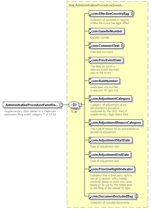 | children | com:EffectiveCountryBag com:GazetteNumber com:CommentText com:PriorEventDate com:RuleNumber com:AdjustmentCategory com:AdjustmentReasonCategory com:AdjustmentStartDate com:AdjustmentEndDate com:PriorUseRightIndicator com:DocumentIncludedBag | ||||