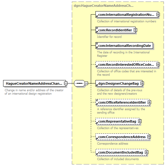 | children | com:InternationalRegistrationNumberBag com:RecordIdentifier com:InternationalRecordingDate com:RecordInterestedOfficeCodeBag dgn:DesignerChangeBag com:OfficeReferenceIdentifier com:RepresentativeBag com:CorrespondenceAddress com:DocumentIncludedBag | ||||