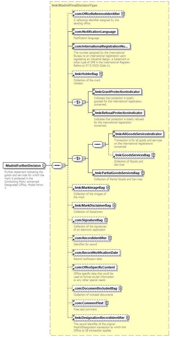 | children | com:OfficeReferenceIdentifier com:NotificationLanguage com:InternationalRegistrationNumber tmk:HolderBag tmk:GrantProtectionIndicator tmk:RefusalProtectionIndicator tmk:AllGoodsServicesIndicator tmk:GoodsServicesBag tmk:PartialGoodsServicesBag tmk:MarkImageBag tmk:MarkDisclaimerBag com:SignatureBag com:RecordIdentifier com:RecordNotificationDate com:OfficeSpecificContent com:DocumentIncludedBag com:CommentText tmk:DesignationRecordIdentifier | ||||