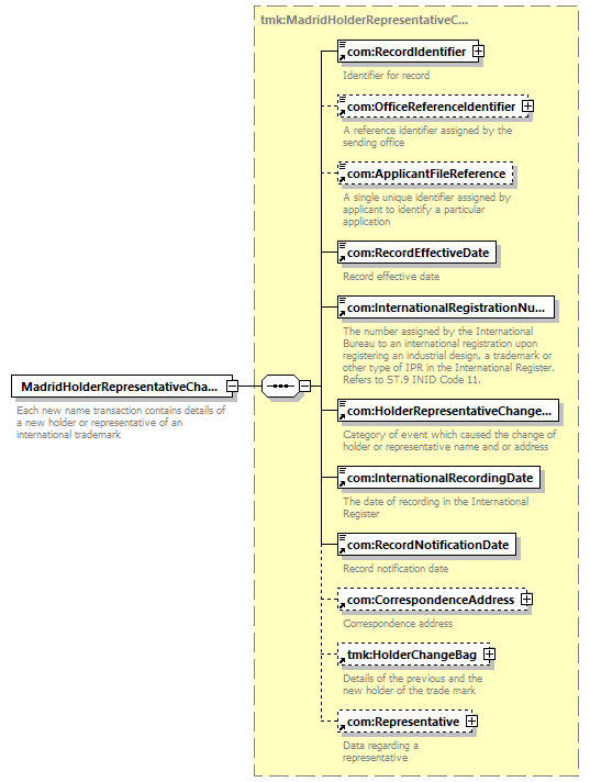 | children | com:RecordIdentifier com:OfficeReferenceIdentifier com:ApplicantFileReference com:RecordEffectiveDate com:InternationalRegistrationNumber com:HolderRepresentativeChangeCategory com:InternationalRecordingDate com:RecordNotificationDate com:CorrespondenceAddress tmk:HolderChangeBag com:Representative | ||||