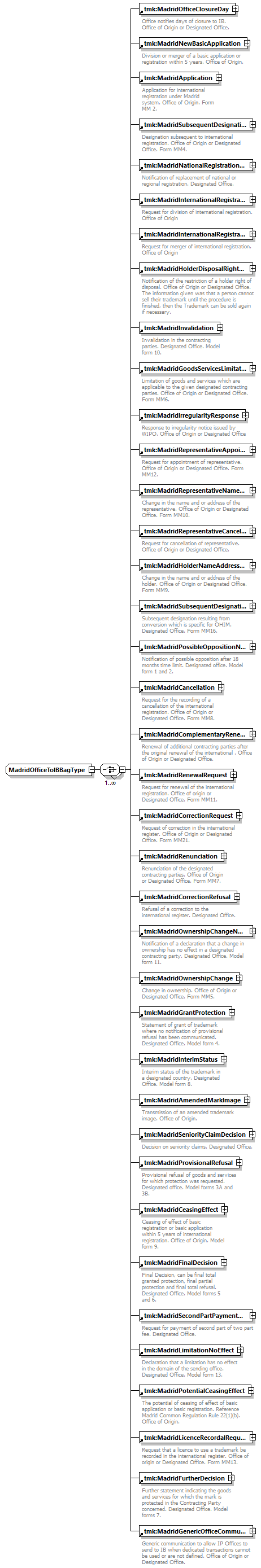 | children | tmk:MadridOfficeClosureDay tmk:MadridNewBasicApplication tmk:MadridApplication tmk:MadridSubsequentDesignation tmk:MadridNationalRegistrationReplacement tmk:MadridInternationalRegistrationDivisionRequest tmk:MadridInternationalRegistrationMergerRequest tmk:MadridHolderDisposalRightRestriction tmk:MadridInvalidation tmk:MadridGoodsServicesLimitationRequest tmk:MadridIrregularityResponse tmk:MadridRepresentativeAppointment tmk:MadridRepresentativeNameAddressChange tmk:MadridRepresentativeCancellation tmk:MadridHolderNameAddressChange tmk:MadridSubsequentDesignationFromConversion tmk:MadridPossibleOppositionNotification tmk:MadridCancellation tmk:MadridComplementaryRenewal tmk:MadridRenewalRequest tmk:MadridCorrectionRequest tmk:MadridRenunciation tmk:MadridCorrectionRefusal tmk:MadridOwnershipChangeNoEffect tmk:MadridOwnershipChange tmk:MadridGrantProtection tmk:MadridInterimStatus tmk:MadridAmendedMarkImage tmk:MadridSeniorityClaimDecision tmk:MadridProvisionalRefusal tmk:MadridCeasingEffect tmk:MadridFinalDecision tmk:MadridSecondPartPaymentRequest tmk:MadridLimitationNoEffect tmk:MadridPotentialCeasingEffect tmk:MadridLicenceRecordalRequest tmk:MadridFurtherDecision tmk:MadridGenericOfficeCommunication | ||||