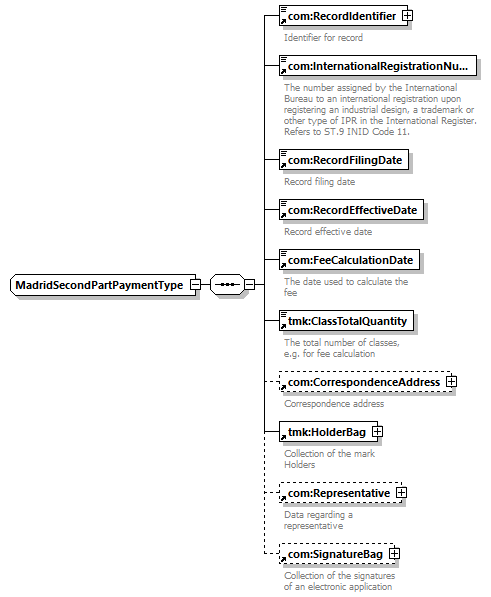 | children | com:RecordIdentifier com:InternationalRegistrationNumber com:RecordFilingDate com:RecordEffectiveDate com:FeeCalculationDate tmk:ClassTotalQuantity com:CorrespondenceAddress tmk:HolderBag com:Representative com:SignatureBag | ||||