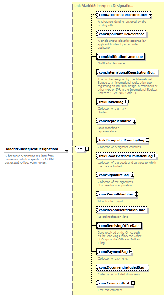 | children | com:OfficeReferenceIdentifier com:ApplicantFileReference com:NotificationLanguage com:InternationalRegistrationNumber tmk:HolderBag com:Representative tmk:DesignatedCountryBag tmk:GoodsServicesLimitationBag com:SignatureBag com:RecordIdentifier com:RecordNotificationDate com:ReceivingOfficeDate com:PaymentBag com:DocumentIncludedBag com:CommentText | ||||