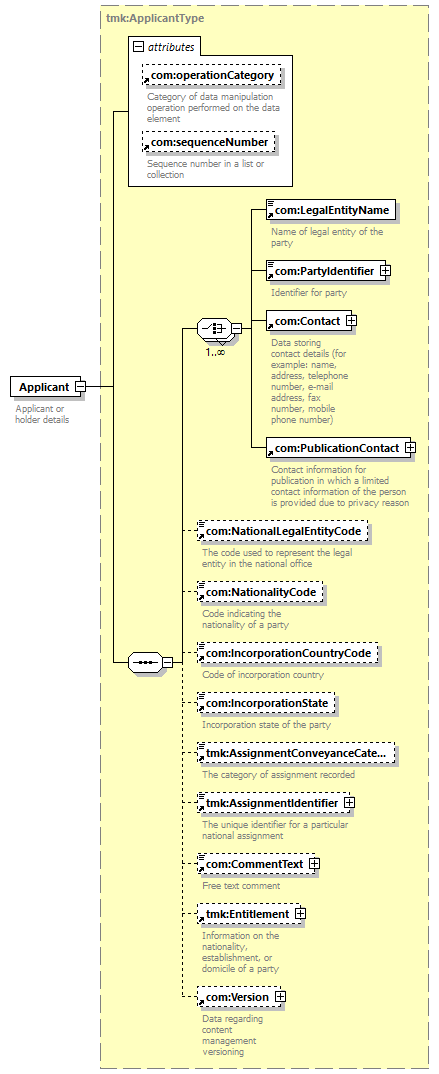 | children | com:LegalEntityName com:PartyIdentifier com:Contact com:PublicationContact com:NationalLegalEntityCode com:NationalityCode com:IncorporationCountryCode com:IncorporationState tmk:AssignmentConveyanceCategory tmk:AssignmentIdentifier com:CommentText tmk:Entitlement com:Version | |||||||||||||||||||||||||||||||||