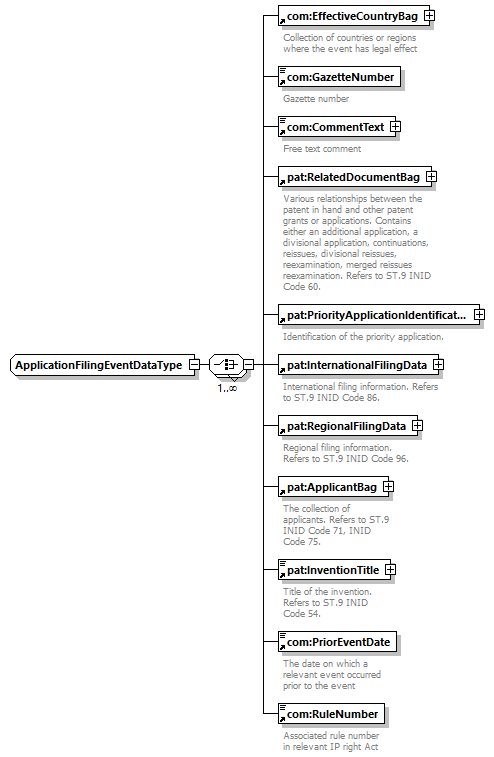 | children | com:EffectiveCountryBag com:GazetteNumber com:CommentText pat:RelatedDocumentBag pat:PriorityApplicationIdentification pat:InternationalFilingData pat:RegionalFilingData pat:ApplicantBag pat:InventionTitle com:PriorEventDate com:RuleNumber | ||||
