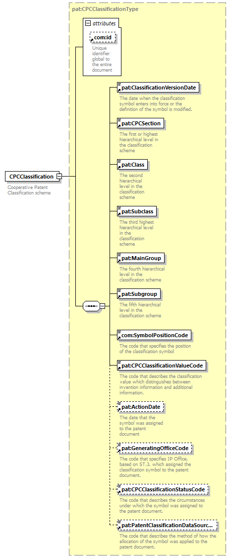 | children | pat:ClassificationVersionDate pat:CPCSection pat:Class pat:Subclass pat:MainGroup pat:Subgroup com:SymbolPositionCode pat:CPCClassificationValueCode pat:ActionDate pat:GeneratingOfficeCode pat:CPCClassificationStatusCode pat:PatentClassificationDataSourceCode | ||||||||||||||||||||||