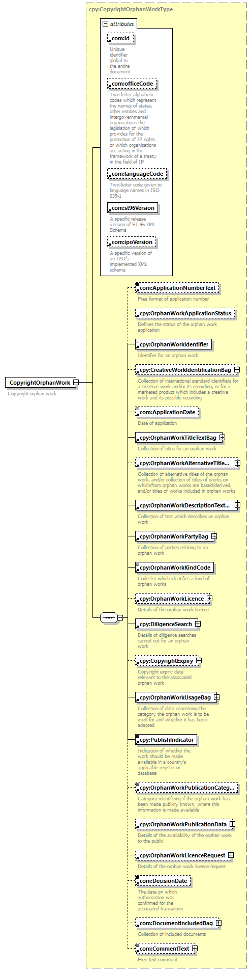 com:ApplicationNumberText cpy:OrphanWorkApplicationStatus cpy:OrphanWorkIdentifier cpy:CreativeWorkIdentificationBag com:ApplicationDate cpy:OrphanWorkTitleTextBag cpy:OrphanWorkAlternativeTitleTextBag cpy:OrphanWorkDescriptionTextBag cpy:OrphanWorkPartyBag cpy:OrphanWorkKindCode cpy:OrphanWorkLicence cpy:DiligenceSearch cpy:CopyrightExpiry cpy:OrphanWorkUsageBag cpy:PublishIndicator cpy:OrphanWorkPublicationCategory cpy:OrphanWorkPublicationData cpy:OrphanWorkLicenceRequest com:DecisionDate com:DocumentIncludedBag com:CommentText
