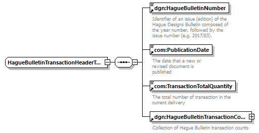 | children | dgn:HagueBulletinNumber com:PublicationDate com:TransactionTotalQuantity dgn:HagueBulletinTransactionCountBag | ||||
