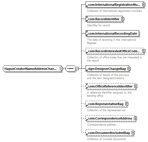 | children | com:InternationalRegistrationNumberBag com:RecordIdentifier com:InternationalRecordingDate com:RecordInterestedOfficeCodeBag dgn:DesignerChangeBag com:OfficeReferenceIdentifier com:RepresentativeBag com:CorrespondenceAddress com:DocumentIncludedBag | ||||
