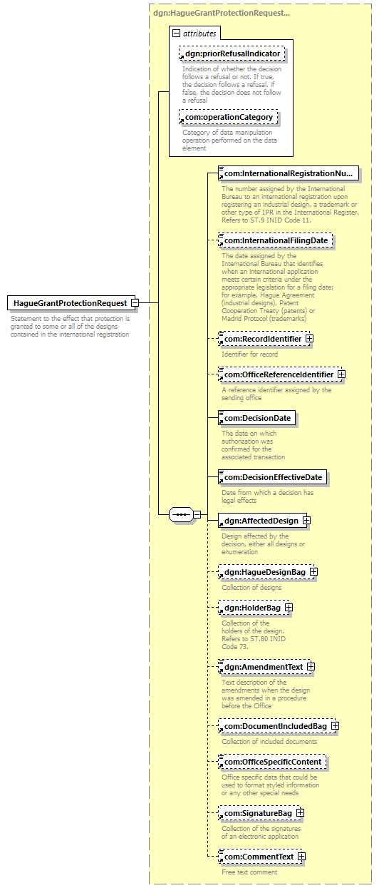 | children | com:InternationalRegistrationNumber com:InternationalFilingDate com:RecordIdentifier com:OfficeReferenceIdentifier com:DecisionDate com:DecisionEffectiveDate dgn:AffectedDesign dgn:HagueDesignBag dgn:HolderBag dgn:AmendmentText com:DocumentIncludedBag com:OfficeSpecificContent com:SignatureBag com:CommentText | |||||||||||||||||||||||||||||||||