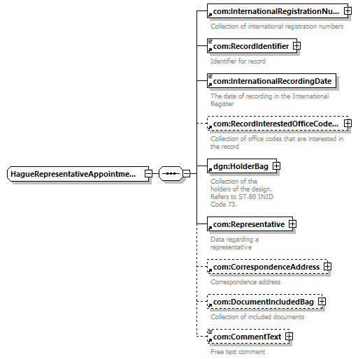 | children | com:InternationalRegistrationNumberBag com:RecordIdentifier com:InternationalRecordingDate com:RecordInterestedOfficeCodeBag dgn:HolderBag com:Representative com:CorrespondenceAddress com:DocumentIncludedBag com:CommentText | ||||