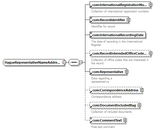 | children | com:InternationalRegistrationNumberBag com:RecordIdentifier com:InternationalRecordingDate com:RecordInterestedOfficeCodeBag com:Representative com:CorrespondenceAddress com:DocumentIncludedBag com:CommentText | ||||