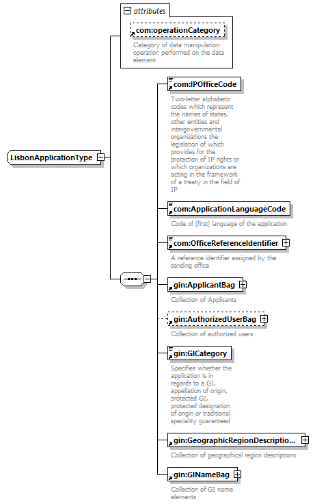 | children | com:IPOfficeCode com:ApplicationLanguageCode com:OfficeReferenceIdentifier gin:ApplicantBag gin:AuthorizedUserBag gin:GICategory gin:GeographicRegionDescriptionBag gin:GINameBag | ||||||||||||||||||||||